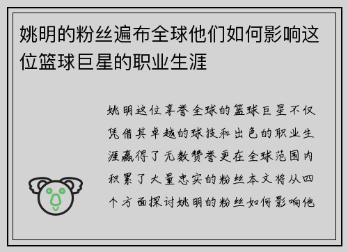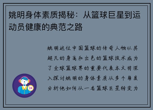 姚明,这位中国篮球巨星不仅在球场上留下了辉煌的足迹,更在退役后积极投身于体育事业,影响力遍及全球。本文将从姚明的职业生涯、社会责任感、体育产业的发展以及国际文化交流四个方面,深入探讨他的追梦之路与全球影响力。在职业生涯中,他以出色的表现征服了无数球迷,并成为NBA历史上最具代表性的外籍球员之一。与此同时,姚明始终关注社会问题,通过各种慈善活动和公益项目展现出强烈的社会责任感。此外,他对中国体育产业...